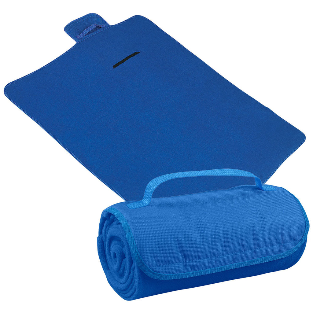 The Hit Royal Blue Roll-Up Blanket with a corporate logo is ideal for beach resorts, cruise ships, or general travel. The large, polyester fleece blanket with a matching color flap easily folds within itself using a hook and loop closure. The handle means this can be easily grabbed and moved to the perfect chair or spot on the beach and then surface washed and reused.