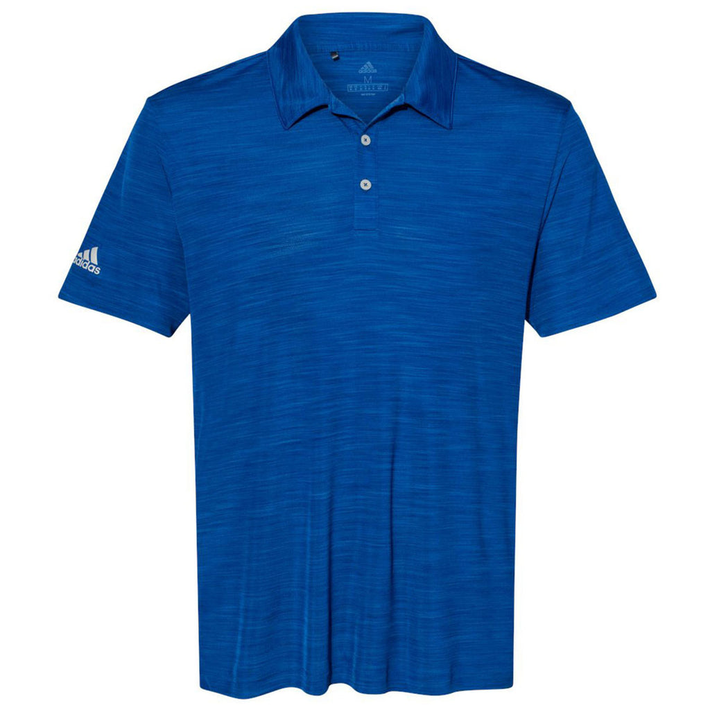 Play the back nine in an embroidery Adidas Men's Collegiate Royal Melange Sport Polo. Made of environmentally friendly 100% recycled polyester with striated heather interlock in a lightweight feel, this sport shirt will stand up to hard work, play, or fun. Add a company logo to use these as employee apparel or gifts that will be put to use immediately. The self-fabric collar, three button placket, and open hem sleeves and bottom hem offer a perfect business friendly look when paired with a jacket. Use as corporate apparel with a custom logo to stand out and get noticed or simply enhance your personal wardrobe.