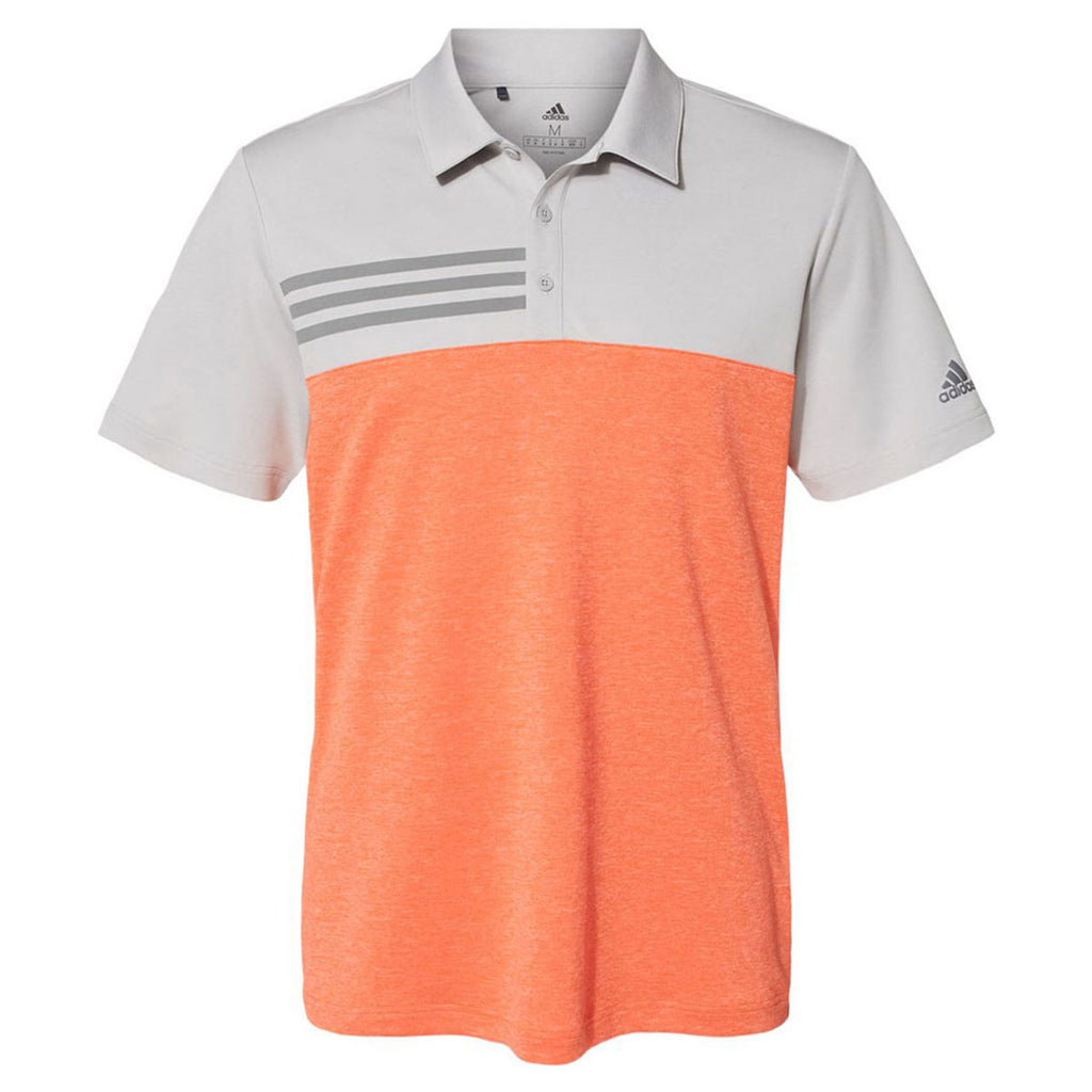 Keep it interesting with a custom adidas Men's Grey Two/Hi-Res Coral Heathered Colorblock 3-Stripes Sport Shirt. This unique colorblocked short sleeve shirt offers one color on the torso and another on the upper chest with triple Adidas stripes on the right side. Made of 100% recycled polyester, this shirt is well made and good for the environment. Add a custom logo to offer as corporate apparel that can easily transition to an after-work date. The UPF 50+ will keep you protected on that extra round of golf and keep you relaxed while enjoying a drink after.
