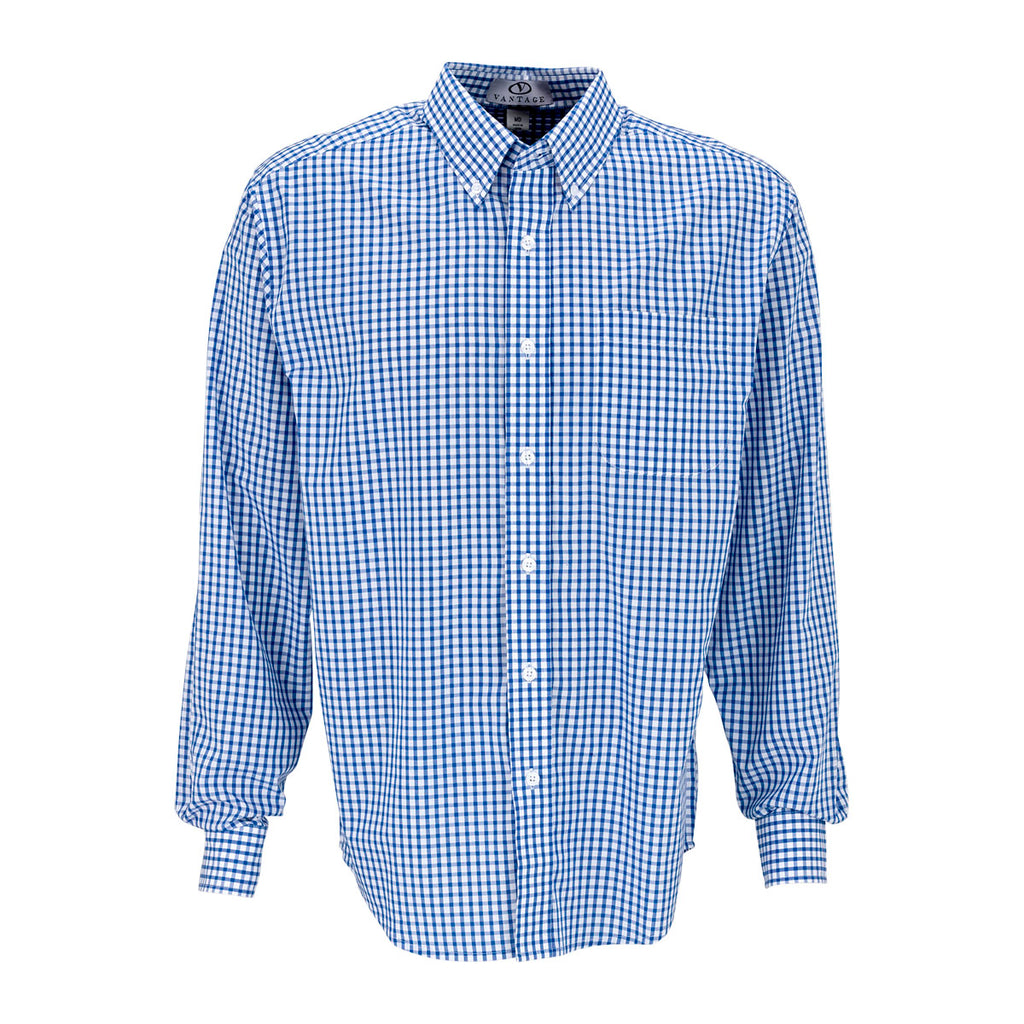 Enjoy care free fashion by ordering the company logoed Vantage Men's Royal/White Easy-Care Gingham Check Shirt. The pure cotton fabric allows you to wear the stylish corporate apparel as an only shirt during the warmer months of the year and as the second layer to keep you warm when Old Man Winter comes a calling. Rugged polyester strengthens the cotton to produce a rip and tear resistant shirt. Wear the shirt at the office and keep it on during a professional networking event at night. Add a custom logo on the large imprint area to promote your products among your professional peers.Highlights