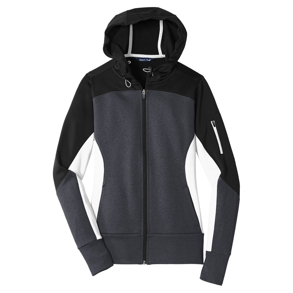 Sport-Tek Women's Black/Graphite Heather/White Tech Fleece Colorblock Full-Zip Hooded Jacket