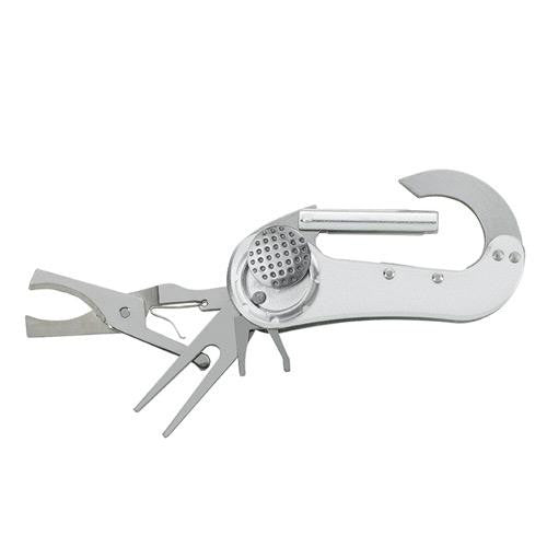 - The tool includes: ball marker, divot repair tool, cigar cutter, spike tightender, carabiner