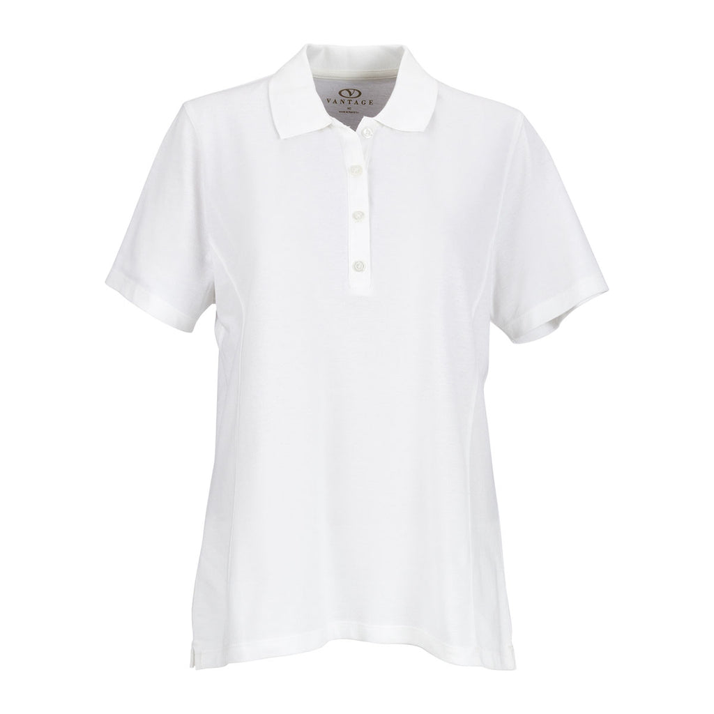 Enjoy the feel and appearance of the embroidered Vantage Women's White Perfect Polo, which uses fine gauge pique to create strong corporate apparel for all occasions. Extra length in the body offers you more fabric to tuck the shirt in for formal corporate events. A little spandex enhances your mobility to give you a polo that works well in several different sports settings. Wear the versatile polo with a pair of khakis and pair the chic company garment with dress slacks. Pure combed cotton feels super soft against the skin to ensure you feel fresh throughout the day. Add a custom logo and watch recognition of your products reach more customer prospects.Corresponding Men's Style: Vantage Men's White Perfect Polo