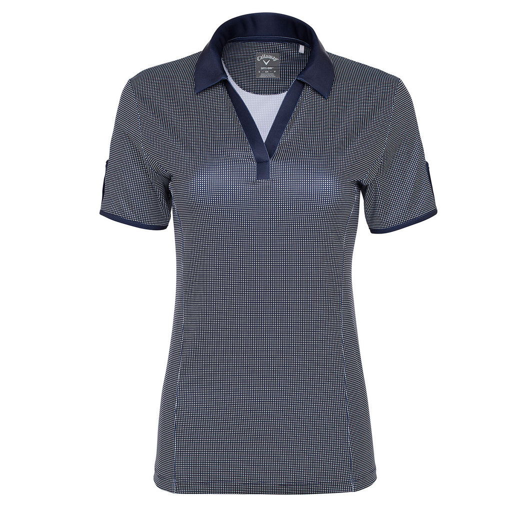 Design embroidery for the Callaway Women's Peacoat Navy Gingham Polo for a unique employee uniform that everyone will love. The soft gingham pattern on this V-neck creates a soft and approachable look that can serve as corporate apparel or every day wear. Add a custom logo to use at golf events for separate teams. Created from a polyester rich jersey blend, this polo wicks moisture away from the skin and offers a UPF 50+ to keep you safe from the sun.