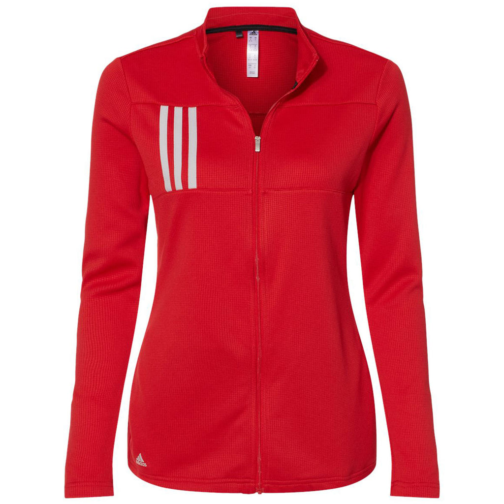 Your custom logo will stand out on the adidas Women's Team Collegiate Red/Grey Two 3-Stripes Double Knit Full-Zip made of 100% recycled polyester. The beautiful waffle texture knit construction has a self-collar and moisture management properties to keep you looking and feeling your best as you go about your day. Add a company logo to offer as employee gifts or as a unique choice for employee apparel. The full zip style allows for easy on and off of the double knit whether you are headed out on your morning commute or going for a jog in the park.