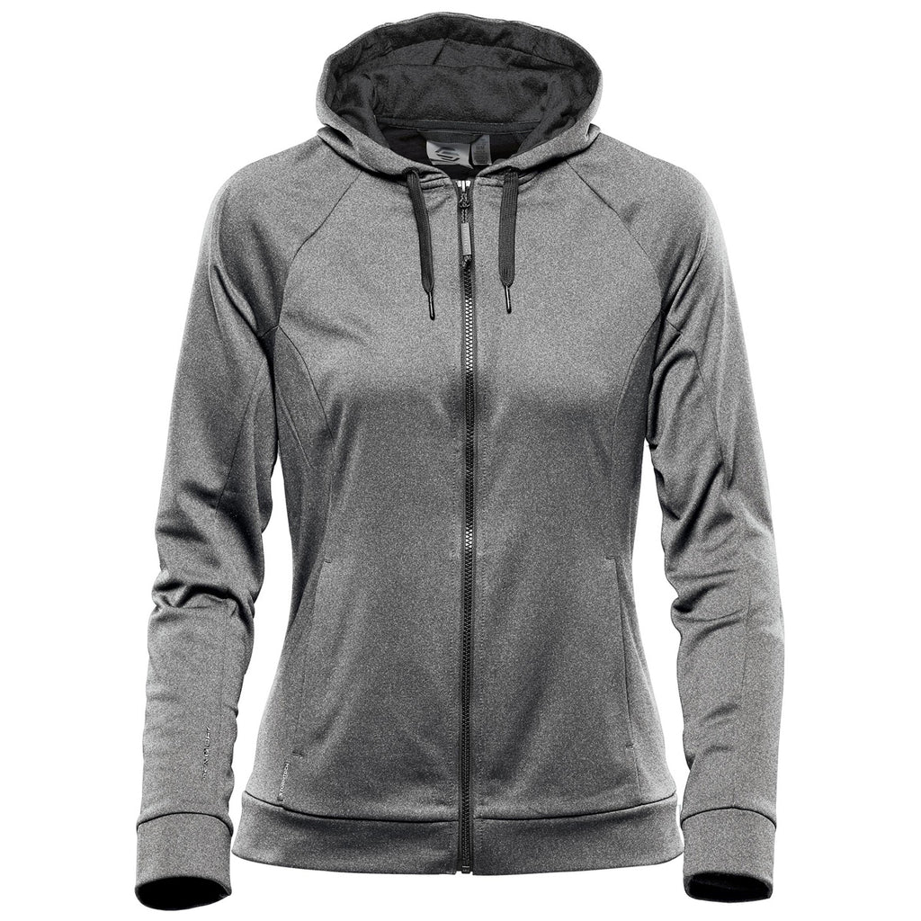 Step up in a custom Stormtech Women's Grey Melange Halifax Hoody. This technical hoody is highly versatile and functional with a water-repellant finish, moisture wicking, and a finish that keeps your core warm and dry when cold weather first starts to set in. Add a company logo to offer these as employee gifts or to sale in your logoed apparel line as workout or general wear. The hoody offers a full front zip so it can easily be worn as a hoody or a lightweight jacket while working out as a layering option. Wear to go on a run, to run errands, or on your commute for a relaxed, laid back look that keeps you comfortable.Corresponding Men's Style:Stormtech Men's Grey Melange Halifax Hoody