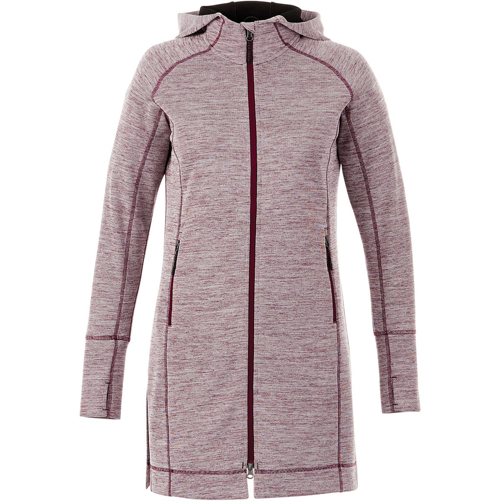 Elevate Women's Maroon Heather Odell Knit Zip Hoody is not only on point, but comes in a functional tunic length for women who want to look and feel their best. Perfect as a corporate gift or as required employee apparel, no one will complain about this moisture wicking hoody with sleeve cuffs, ear bud cord guide, exit port, and thumb exits. Whether working in cold weather or taking part in a team building activity these hoodies with a custom logo will be a must have. Corporate embroidery is a great way to showcase your company while allowing everyone to look their best. Order several in one of four available colors and a range of sizes!Corresponding Men's Style:Elevate Men's Maroon Heather Odell Knit Zip Hoody