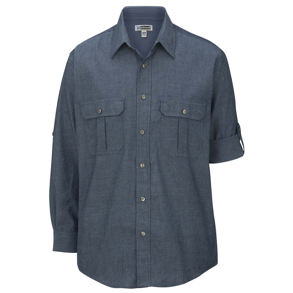 Built to spend time indoors or out, the custom Edwards Men's Chambray Blue Roll-Up Sleeve Shirt is both rugged and functional in a cotton polyester blend. Available in three basic colors, this shirt will carry your embroidery with pride. The roll up sleeve with inside tab and button closure offer a bit of additional flair for these shirts that would make perfect employee apparel or even corporate apparel for retreats or specialized events. Looks great whether worn tucked or untucked, this shirt truly has it all with moisture wicking.