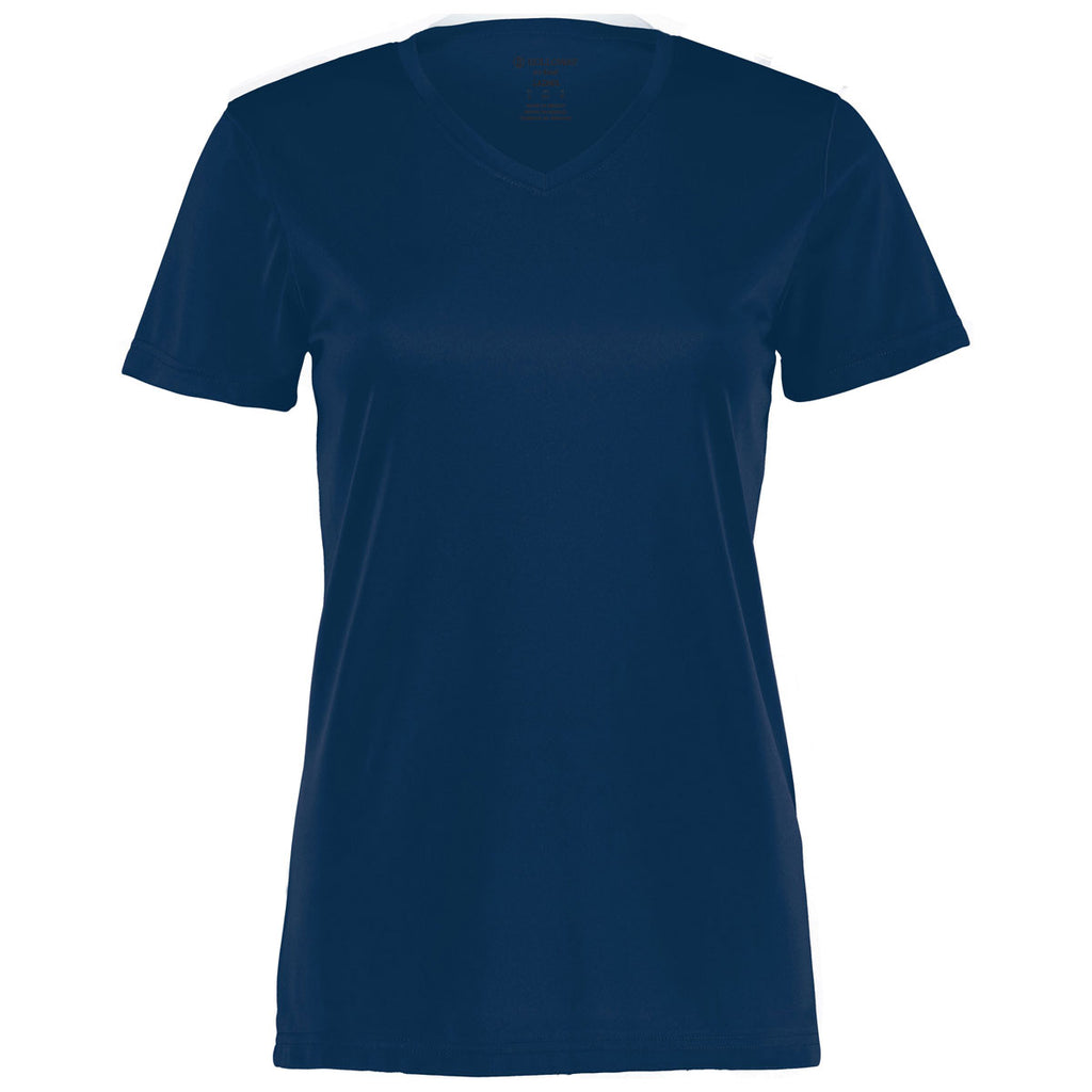 Custom screen print will pop on the Holloway Women's Navy Momentum Tee. This simple, straightforward tee is a must have as daily comfort wear that can be dressed up or down as needed. A basic tee is a wardrobe staple that can serve many purposes. Add a company logo to use as part of a uniform or a custom design to show affiliation with a group, club, or team. The feminine fitting tee is color secure, wicks moisture, and is odor resistant with V-neck collar and set-in sleeves. The possibilities are endless with this tee, so place your order right away.Corresponding Men's Style:Holloway Men's Navy Momentum Tee