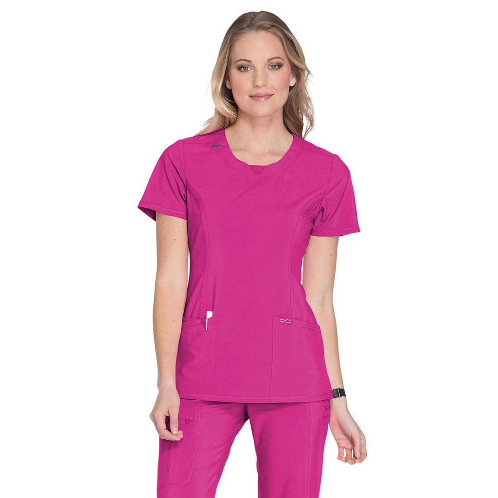 If clothes make the woman, then the custom logoed Cherokee Women's Carmine Pink Infinity Round Neck Top will make the busy healthcare professional. With a sleek round neck top, the flattering medical shirt includes a rib inset containing shoulder yokes, as well as front and back princess seams. The slimming shape of the round neck top provides more space for you to move comfortably throughout every shift. Attach your corporate logo for transforming your healthcare facility into a renowned place to receive medical care. A bungee ID badge loop that attaches to the right shoulder presents your professional credentials with style.Highlights