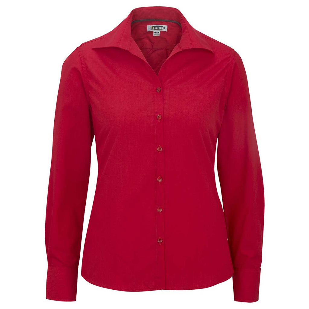 A custom dress shirt look with a comfortable feel comes together with the Edwards Women's Red Lightweight Open Neck Poplin Blouse. Made to stand up to the demanding wear of customer service or restaurants, these make great employee apparel for those that work the hardest. Add a custom logo and choose the color you like best as hospitality apparel. Made of polyester and cotton, this long sleeve shirt with matching buttons, countered seams, and open neck this shirt can easily go from the office to the sales floor and anywhere in between. Choose the color and embroidery you like best and place an order.Highlights