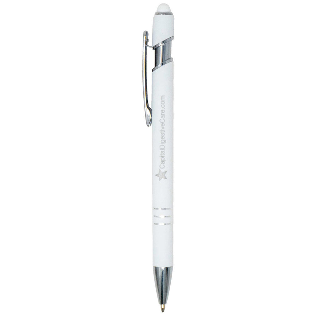 Hub Pens White Textari Comfort Cloud Stylus Pen with a corporate design will leave you on cloud nine. This rubberized pure white metal barrel with colorful stylus tips combines writing comfort and stylus functionality. Ideal for those who are always on the go, this pen can be shared with recruits, traveling agents, and work-from-home employees. Order today.