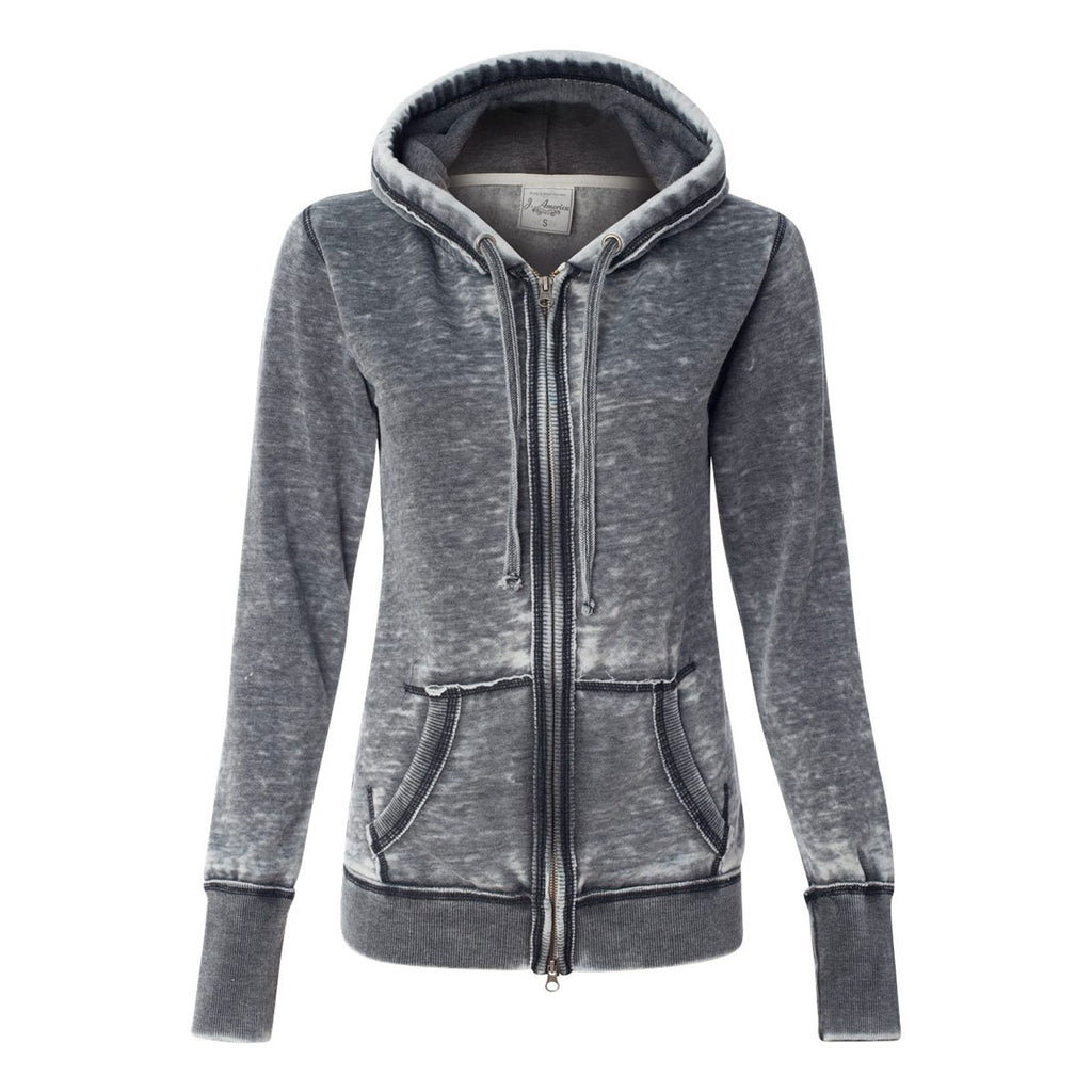 Reward the customer service professionals on your team by giving the embroidered J. America Women's Dark Smoke Zen Fleece Full-Zip Hooded Sweatshirt. Acid wash burnout fleece finished with glossy silicone will make you stand out at the next outdoor corporate event. Attach your corporate logo on the large imprint area to keep your company in the minds of the professional peers you meet at industry conventions. Blended cotton and polyester create a highly durable fabric that feels super soft on the skin. Flat lock stitching around the extra long cuffs prevents fabric fraying to ensure you remain looking sharp during competitive recreational activities.Corresponding Men's Style:J. America Men's Dark Smoke Vintage Zen Fleece Full-Zip Hooded Sweatshirt
