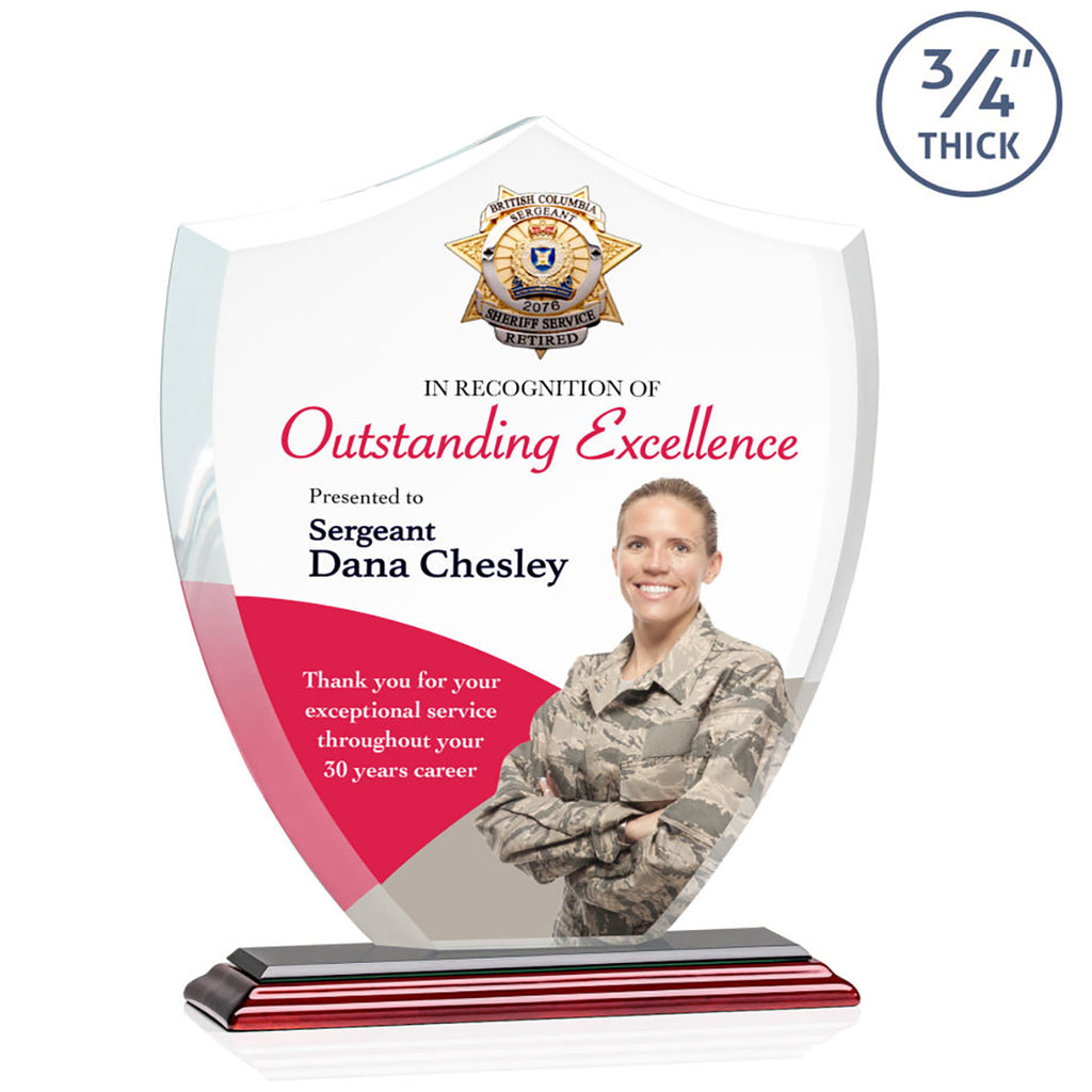 Choose your custom design for the St. Regis Rosewood Scudo Shield Award 7.25" x 8.75" x 3" with Standard Base - Printed to show appreciation to those who show excellence daily. The shield design makes these ideal for first responders, law enforcement, and others who focus on protection, authority, and stability in the community. Order early so you do not miss out.The minimum order for this product is 1 piece.