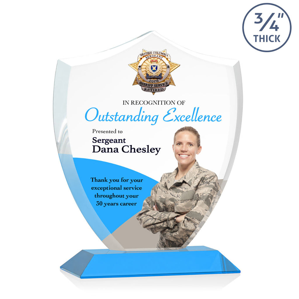 Choose your custom design for the St. Regis Sky Blue Scudo Shield Award 7.25" x 8.75" x 3" with Standard Base - Printed to show appreciation to those who show excellence daily. The shield design makes these ideal for first responders, law enforcement, and others who focus on protection, authority, and stability in the community. Order early so you do not miss out.The minimum order for this product is 1 piece.