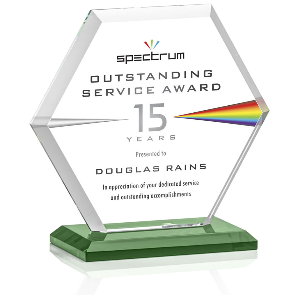 St. Regis Green Barnett Award 6" x 6.25" x 3" - Printed with a custom message comes in multiple sizes to fit your special awards ceremony needs. The beveled Starfire Crystal hexagon is mounted on your choice of bases. Perfect to recognize outstanding service, anniversaries, or anything you choose. Order before your next event.The minimum order for this product is 1 piece.