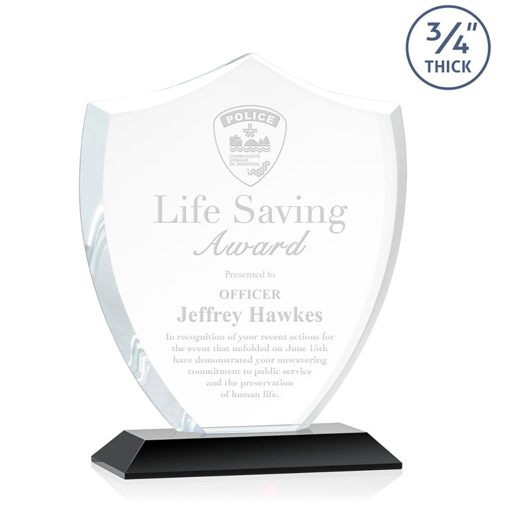 Choose your custom design for the St. Regis Black Scudo Shield Award 7.25" x 8.75" x 3" with Standard Base - Laser Engraved to show appreciation to those who show excellence daily. The shield design makes these ideal for first responders, law enforcement, and others who focus on protection, authority, and stability in the community. Order early so you do not miss out.The minimum order for this product is 1 piece.