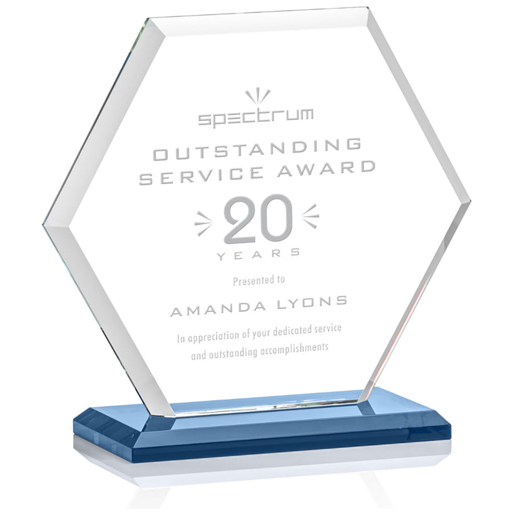 St. Regis Light Blue Barnett Award 7" x 7.25" x 3" - Laser Engraved with a custom message comes in multiple sizes to fit your special awards ceremony needs. The beveled Starfire Crystal hexagon is mounted on your choice of bases. Perfect to recognize outstanding service, anniversaries, or anything you choose. Order before your next event.