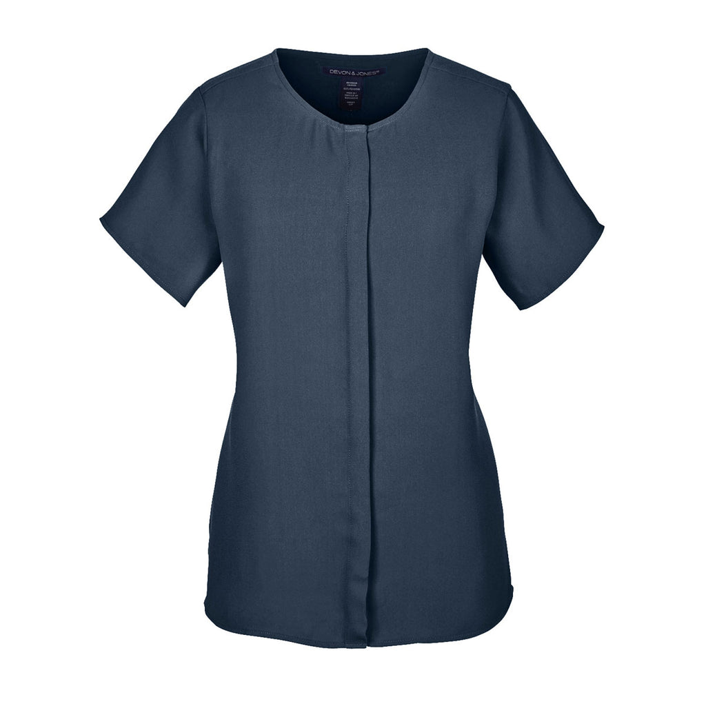 Slip on this Devon & Jones Women's Navy Perfect Fit Short-Sleeve Crepe Blouse to infuse casual comfort into your ensemble thanks to soft hand, fluid drape and flowy look of 100% polyester crepe. A discreet placket conceals buttons. It flaunts an always-flattering and silhouette ready to mix with your existing wardrobe for instant flair. Other features include double layer back yoke with center back pleat and side slits. Create an immediate sense of recognition, deepen your corporate identity and build familiarity and trust for your brand by adding your company's logo to this crepe blouse.Highlights