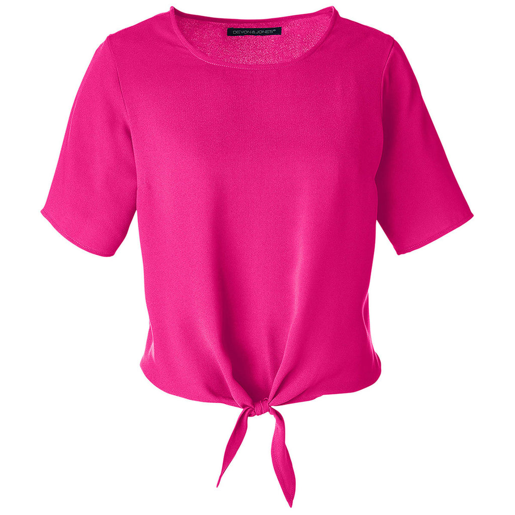 Add custom embroidery to the Devon & Jones Wome Crown Raspberry Perfect Fit Tie-Front Blouse for a look that is both fun and fashionable. A slight throwback with an updated approach, this blouse will get you noticed. Made of lightweight polyester crepe with a feminine scoop neckline, the tie-front detail at the center front hem makes this a true must have. Choose a company logo to use these as employee apparel or gifts that show creativity.Highlights