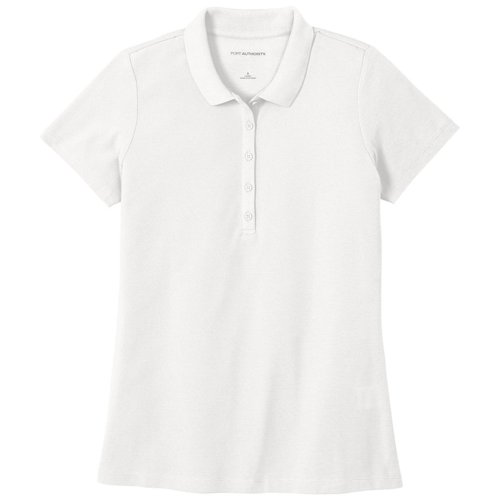 Design a custom embroidery for the Port Authority Women's White SuperPro React Polo for a look that can go from the office to dinner with friends with complete ease. This classic uniform style meets performance wear in this poly cotton polo that is ready for anything life can bring. Add a company logo to create a corporate uniform that is comfortable and convenient with stain release, snag resistance, and Easy Care qualities. The flat knit collar with five button placket makes this polo easy to layer or wear alone. Enjoy a day with friends, at work, or anywhere you please and look great while doing it.Corresponding Men's Style:Port Authority Men's White SuperPro React Polo