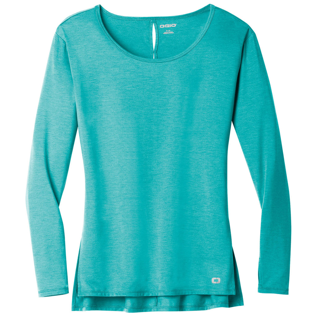 Give the gift that never stops giving for the women on your successful company team by ordering the screen printed OGIO Women's Vivid Teal Luuma Long Sleeve Tunic. The sleek long sleeve shirt is designed with mostly rugged polyester, with about one-quarter of the fabric containing Tencel lyocell for maintaining a super soft feel. Keyhole details on the back of the shirt complement the chic design of the set-in, open hem sleeves. The inviting appearance makes the tunic one of the most approachable corporate shirts available for busy professionals. Add your company logo and watch your brand soar to new heights.
