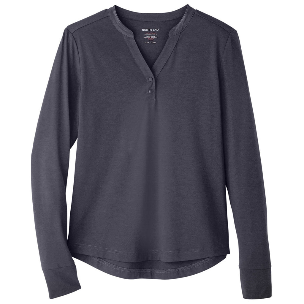 Look and feel great in a custom embroidery North End Women's Carbon Jaq Snap-Up Stretch Performance Pullover. The embroidery you choose will stand out on the polyester rich, lycocell, spandex jersey that is gorgeous when paired with a jacket, but is also perfect when hanging out with friends. The henley placket offers metal two snap closure for easy layering. The self-fabric cuffs with integrated thumbholes make this an option for working out because the hi-low hem provides extra coverage. Stretch performance, active fit, and easy care make this an all around pullover that all will appreciate.Corresponding Men's Style: North End Men's Carbon Jaq Snap-Up Stretch Performance Pullover