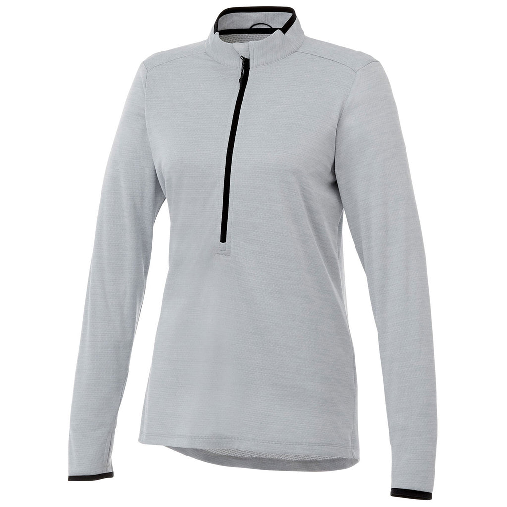 Add a company logo to the Elevate Women's Light Heather Grey Mather Knit Half Zip for a sleek professional look that can go anywhere. This simple half zip is made for easy layering with thumb holes and half zip style that will stand up to a long day's work as employee apparel or a corporate uniform. The shaped seams and tapered waist offer a feminine fit while the moisture wicking, breathable material keeps you comfortable. Made as a wash and wear item with great versatility, this half zip can go from being team mom to head of a corporation with ease.Corresponding Men's Style:Elevate Men's Light Heather Grey Mather Knit Half Zip