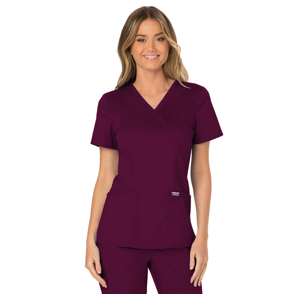 Take healthcare fashion to the next level by wearing the Cherokee Women's Wine Workwear Revolution Mock Wrap Top when it is time to unwind after a grueling day at the clinic. Front and back princess seams present a distinguished appearance that gets you noticed for all of the right fashion reasons. The sleek mock wrap top includes side vents to enhance the appearance of the corporate apparel, as well as circulate air to keep you body comfortably cool. Patch pockets provide quick access to the tools you need for common medical procedures. Add your company logo to get the word out about your world-class medical facility.Highlights