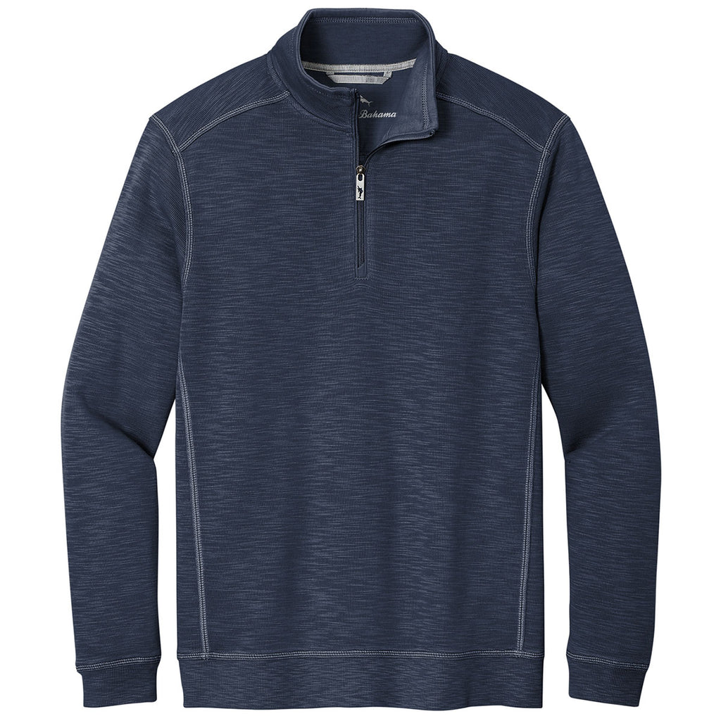 Create a layering piece that will look professional in any setting by adding your company's custom logo or design to the Tommy Bahama Men's Blue Note Tobago Bay Half Zip. On this half-zip sweatshirt, a textured slub knit pairs with a sun-bleached wash to create an effortless pullover that is ideal for any occasion.