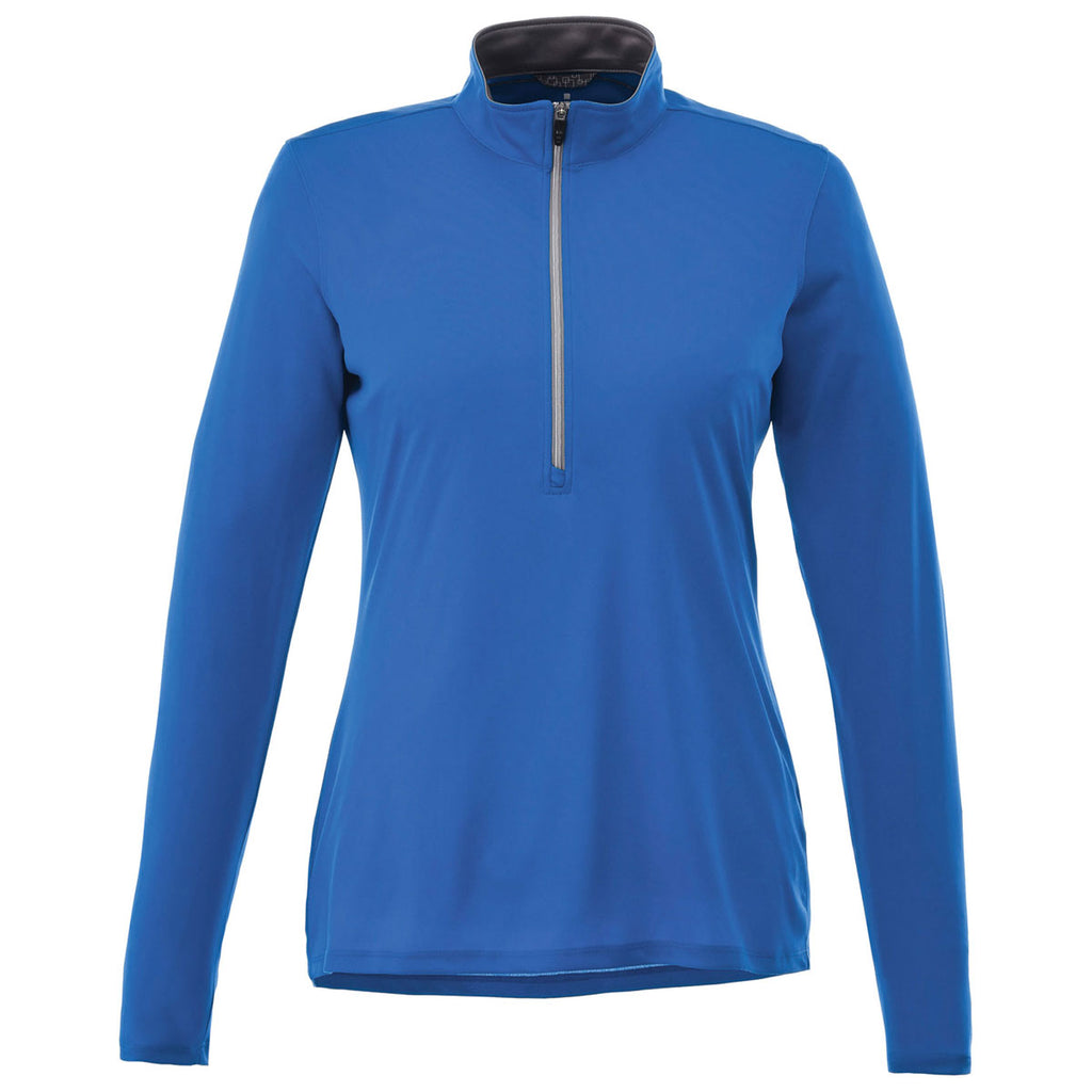 The Elevate Women's New Royal Vega Tech Half Zip with your custom logo is a perfect gift for your loyal female employees. It has a stylish professional look and it features a lightweight breathable but moisture wicking fabric. This fabric has UV protection and resists snagging so it is ideal for sunny days. This piece of wardrobe is designed for wash-and-wear convenience and therefore makes a perfect gift for every modern woman. Because of its versatile look, your employees will gladly wear it not only for corporate events but during their everyday activities. Let your employees know they are appreciated with this half zip.Corresponding Men's Style:Elevate Men's New Royal Vega Tech Quarter Zip