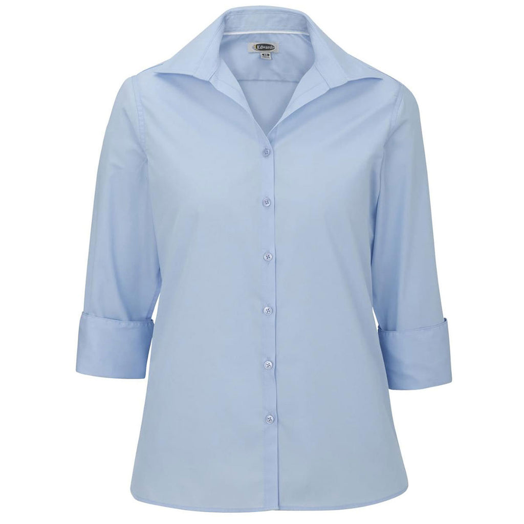 Your company logo will pop on the Edwards Women's Blue Lightweight Poplin Shirt made of lightweight polyester and cotton. The 3/4 sleeve blouse has an open neck with contoured side seams and back darts making it fashionable enough to be used as corporate apparel. Machine washable and wrinkle resistant means all day wear of this shirt will still have you looking and feeling great. Try out a custom logo to use at special events or to show support for a specific organization. The simple button-up is stylish and easy to care for no matter what your day holds.Highlights