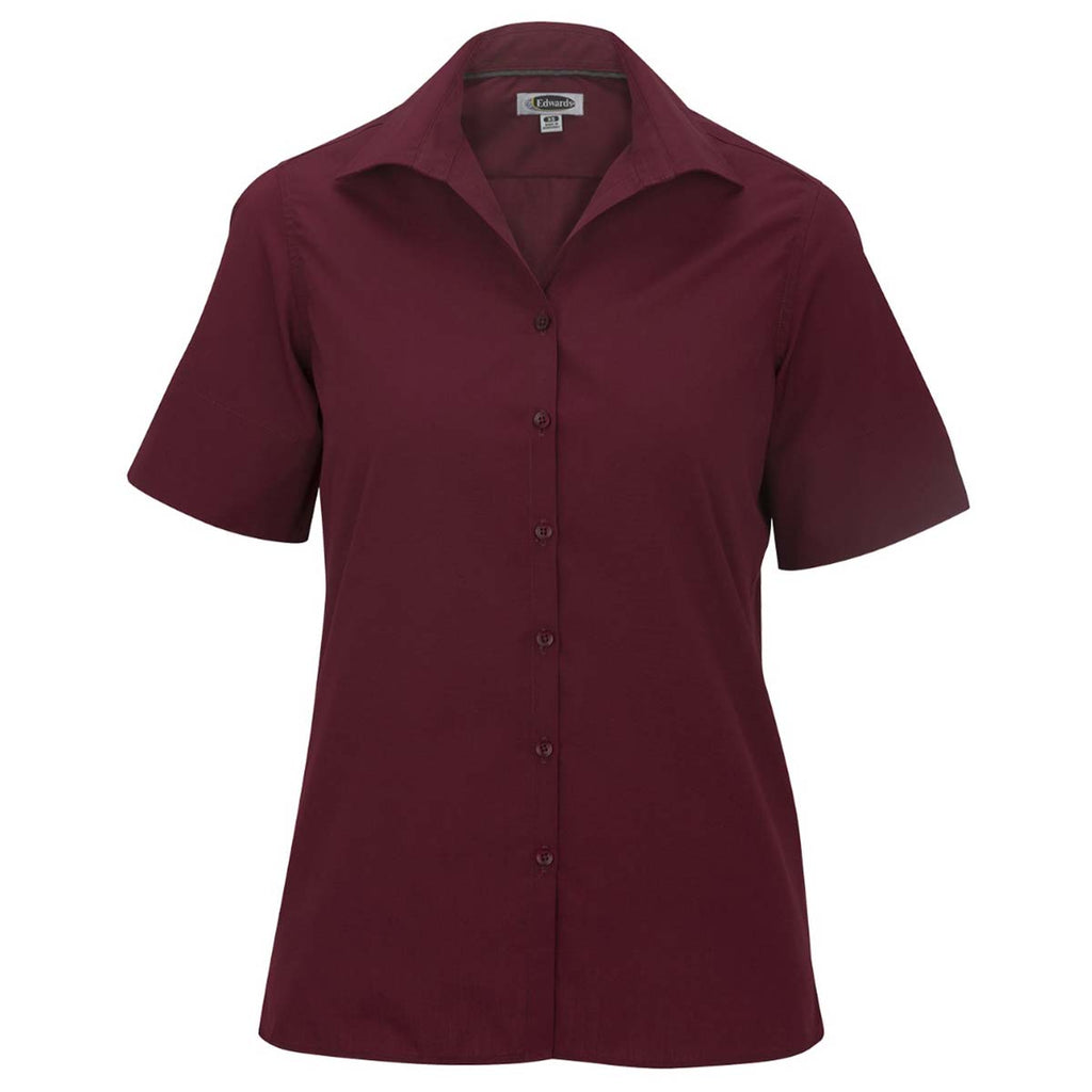A custom dress shirt look with a comfortable feel comes together with the Edwards Women's Burgundy Lightweight Short Sleeve Poplin Blouse. Made to stand up to the demanding wear of customer service or restaurants, these make great employee apparel for those that work the hardest. Add a custom logo and choose the color you like best as hospitality apparel. Made of polyester and cotton, this short sleeve shirt with matching buttons, countered seams, and open neck this shirt can easily go from the office to the sales floor and anywhere in between. Choose the color and embroidery you like best and place an order.Highlights
