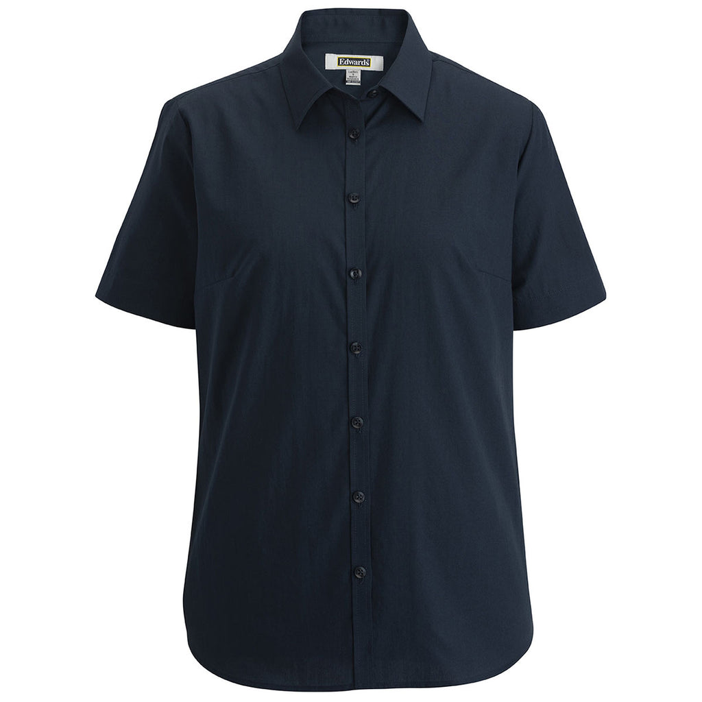 Add a custom embroidery to the Edwards Women's Navy Essential Broadcloth Shirt for a look that can go from day to night with ease. The lightweight short sleeve shirt is professional enough to be worn as corporate apparel, but functional enough to be used as a uniform with your company logo added as an accent. The performance top provides an improved fit with wrinkle resistance and a point collar with permanent stays. Easily cared for through machine or industrial laundering, this is a must have option for large companies who want to maintain continuity of dress.Highlights