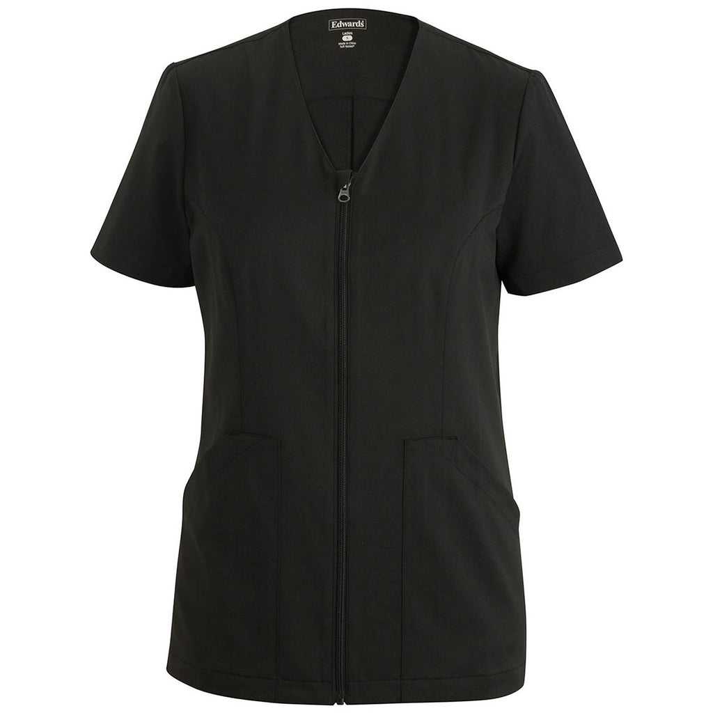 Enjoy a custom look with the Edwards Women's Black Sorrento Power Stretch Service Shirt with embroidery. The lightweight power-stretch polyester allows for natural movement without restriction making it ideal for industries like hairdressing, serving, or cooking as a uniform. The sleek look of the full front zip shirt that can be easily layered is professional while remaining functional. A V-neck with princess seams, angled front pockets, and a traditional fit creates an overall look. Moisture wicking, soil release, and Scotchguard finish also allows for easy wash and wear care.Highlights
