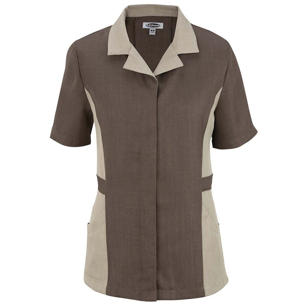 Employee apparel for housekeepers has never looked better than with the Edwards Women's Chestnut Premier Tunic Shirt in six color options with contrasting collar and side panels for a fitted look. Created from 100% polyester, this tunic shirt has all the features needed for a long day of housekeeping duties. The hidden placket, deep hip pocket and accent belt on this corporate embroidered shirt offer a polished look. Excellent as part of corporate uniforms, these short sleeve shirts are easily machine laundered so that they are ready for the next shift.Highlights