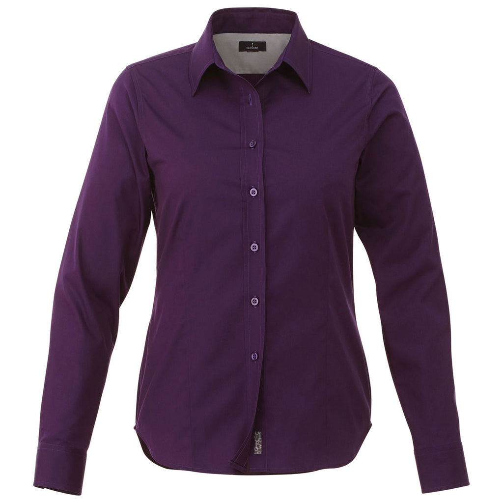 Whether you want a new uniform for your employees or just a present for them, the Elevate Women's Dark Plum Wilshire Long Sleeve Shirt branded with your custom logo is an ideal choice. It has shaped seams and a tapered waist for a more flattering fit. It is also a decoration-friendly design! It is also available in wide range of colors, so you can choose the one that perfectly matches your company logo. Whenever your employees want to look sharp, they will reach for the Elevate Women's Dark Plum Wilshire Long Sleeve Shirt. Advertise your brand in a modern way. Choose this high-quality shirt for your next corporate giveaway.Corresponding Men's Style: Elevate Men's Dark Plum Wilshire Long Sleeve Shirt