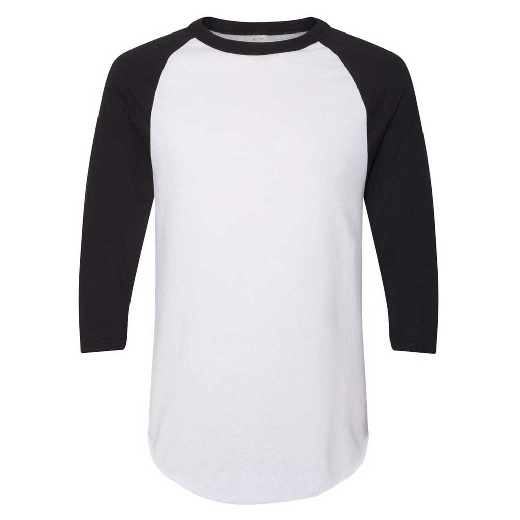 Custom uniforms have never been easier to create than with the Augusta Sportswear Men's White/Black Three-Quarter Raglan Sleeve Baseball Jersey. This classically designed raglan made of a polyester, cotton blend offers contrasting color rib collar and raglan sleeves for a creative look that will be an instant hit. Add a screen print of your company logo for company-wide events like softball or family games. The double needle hemmed sleeves add extra durability and the surged fishtail bottom provides extra coverage as you slide into home. For a fun twist, add a logo you design to give as gifts or to use as employee apparel where appropriate. Comfort, convenience, and style come together to create this jersey.Highlights