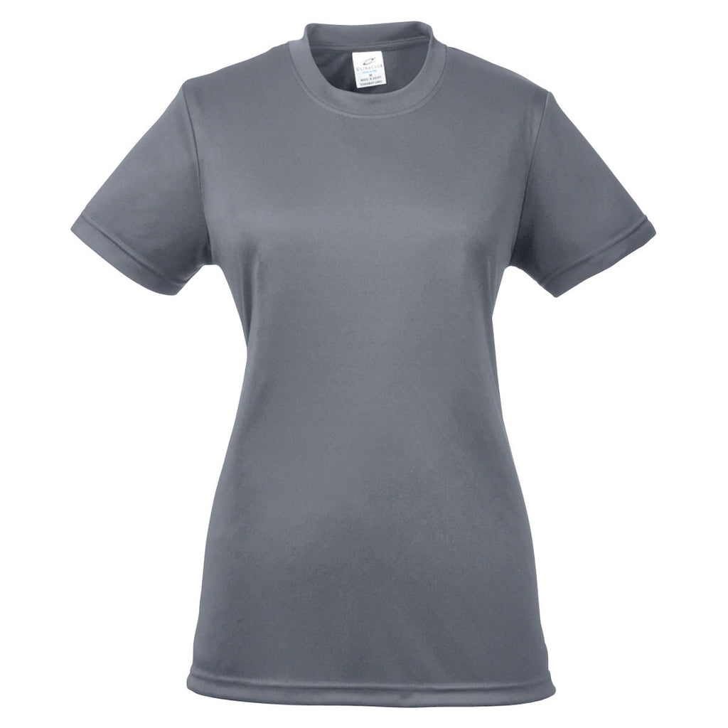 What does cool and dry mean for the UltraClub Women's Charcoal Cool & Dry Basic Performance T-Shirt? It means the t-shirt includes moisture wicking technology that makes uncomfortable perspiration disappear. Dry and cool skin helps you endure grueling prolonged business meetings. One-hundred percent polyester takes all of the punishment you encounter throughout an athletic event. Wear the multi-purpose t-shirt on the softball field and to a casual corporate social event. Just make sure to add a custom logo that potential customers associate with your company. Logoed corporate apparel help sell your products and services.Corresponding Men's Style: UltraClub Men's Charcoal Cool & Dry Basic Performance T-Shirt