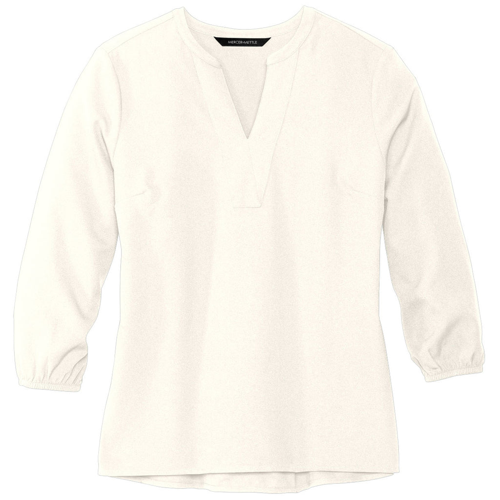 Mercer+Mettle Women's Ivory Chiffon Stretch Crepe 3/4 Sleeve Blouse with custom logo is a stylish desk to dinner option that can be appreciated by all. The crepe fabric provides a relaxed fit with elastic cuffs on the sleeves and a slight drop tail hem for a more elegant and covered look. Ideal for corporate and office apparel, so order today.Highlights