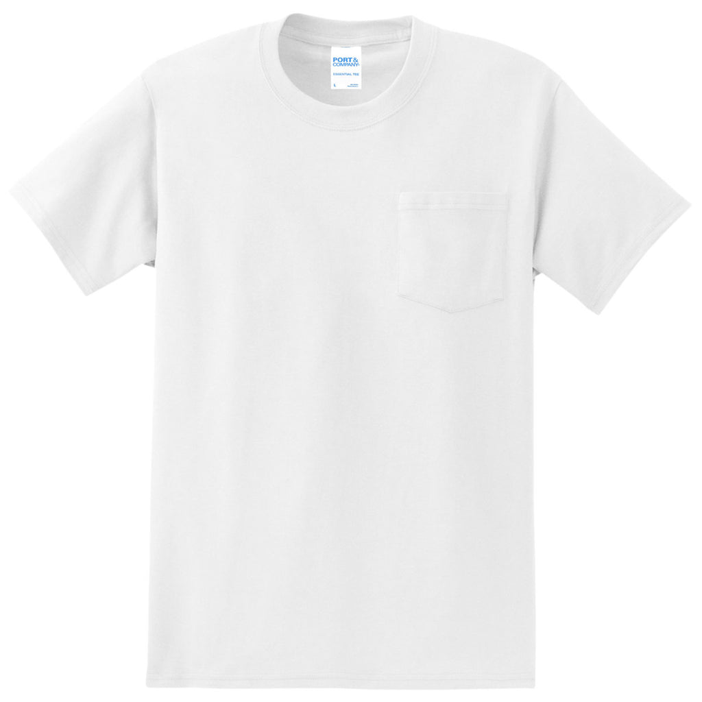 The Port & Company Men's White Essential Pocket Tee is a classic t-shirt that will make sure your brand's custom logo or design always gets the attention it deserves. On the chest, a pocket adds extra visual impact to this wearable piece, which is made from a comfortable, breathable fabric.Highlights