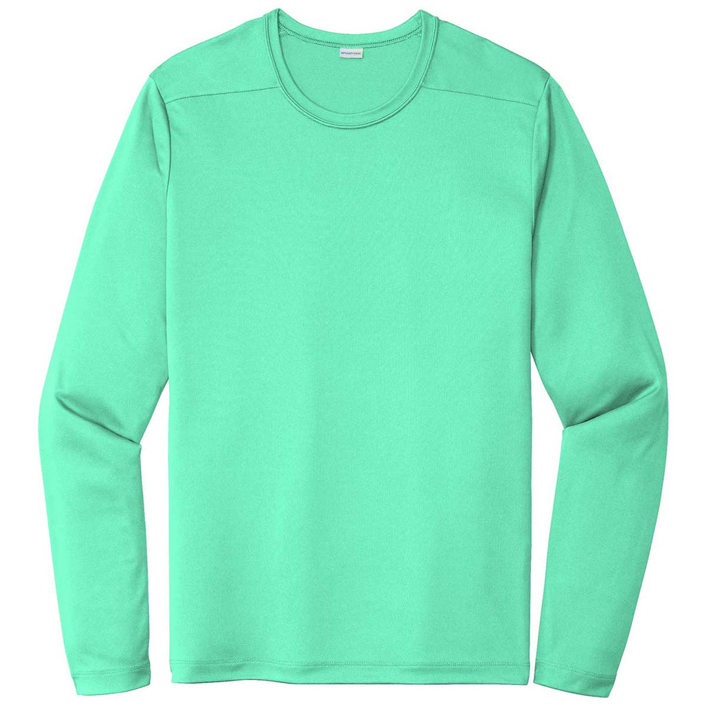 Be ready for the changing weather with the Sport-Tek Men's Bright Seafoam Posi-UV Pro Long Sleeve Tee. Your company logo will stand out on this long sleeve tee complete with removable tag and set-in sleeves. Perfect for fall golf trips with a UPF rating of 50, this shirt will keep you cool with moisture wicking technology or warm on those cooler days with long sleeves. Add a screen print of your company design to use for team events or to give away at corporate events. Ideal for layering or wearing alone for nearly any occasion, this long sleeve tee is a must have.Highlights