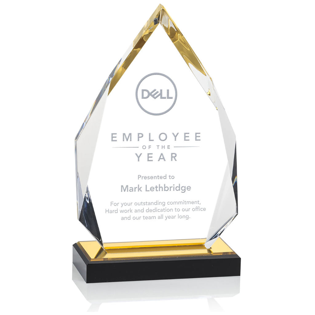 The St. Regis Gold Beckenham Award 5.25" x 8.75" with Standard Base - Laser Engraved with a custom or corporate logo is a wonderful way to recognize a special achievement or goal. The gorgeous ebony base with a golden reflective top radiates gold through the interchanging facets toward the peak. Perfect for employment anniversaries, outstanding service, and top marks.The minimum order for this product is 1 piece.