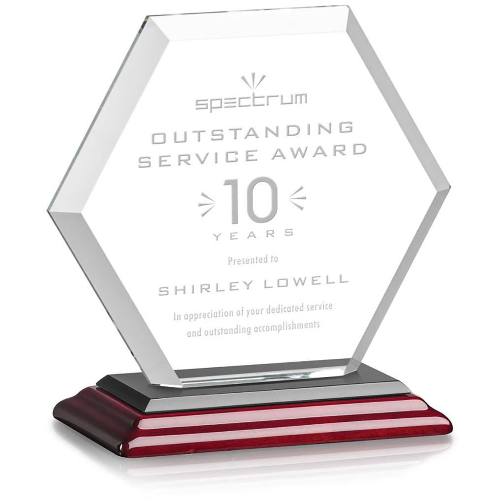 St. Regis Rosewood Barnett Award 5" x 5.25" x 3" - Laser Engraved with a custom message comes in multiple sizes to fit your special awards ceremony needs. The beveled Starfire Crystal hexagon is mounted on your choice of bases. Perfect to recognize outstanding service, anniversaries, or anything you choose. Order before your next event.The minimum order for this product is 1 piece.