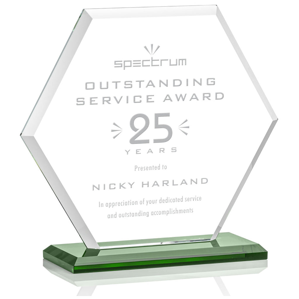 St. Regis Green Barnett Award 8" x 8.25" x 3" - Laser Engraved with a custom message comes in multiple sizes to fit your special awards ceremony needs. The beveled Starfire Crystal hexagon is mounted on your choice of bases. Perfect to recognize outstanding service, anniversaries, or anything you choose. Order before your next event.