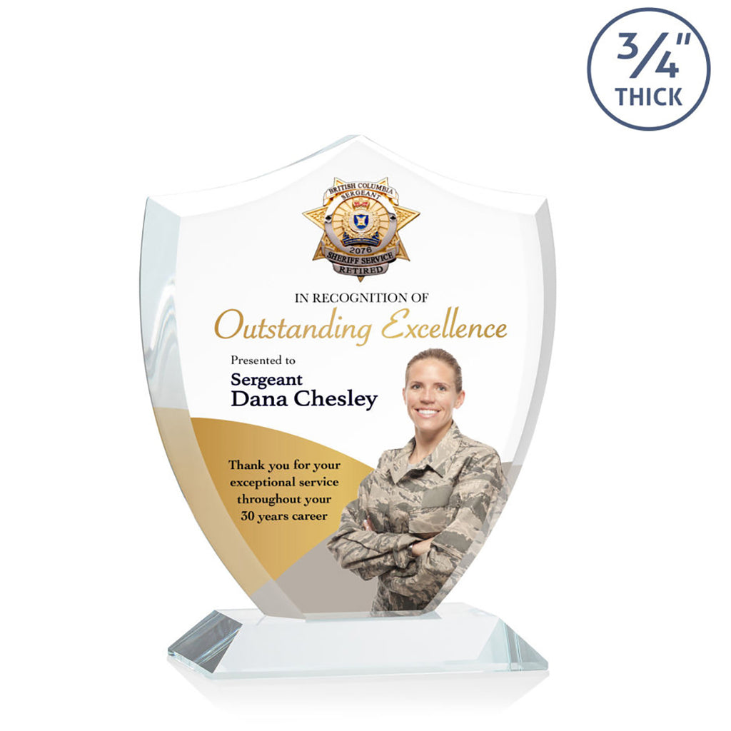 Choose your custom design for the St. Regis Clear Scudo Shield Award 6.25" x 7.75" x 3" with Standard Base - Printed to show appreciation to those who show excellence daily. The shield design makes these ideal for first responders, law enforcement, and others who focus on protection, authority, and stability in the community. Order early so you do not miss out.The minimum order for this product is 1 piece.