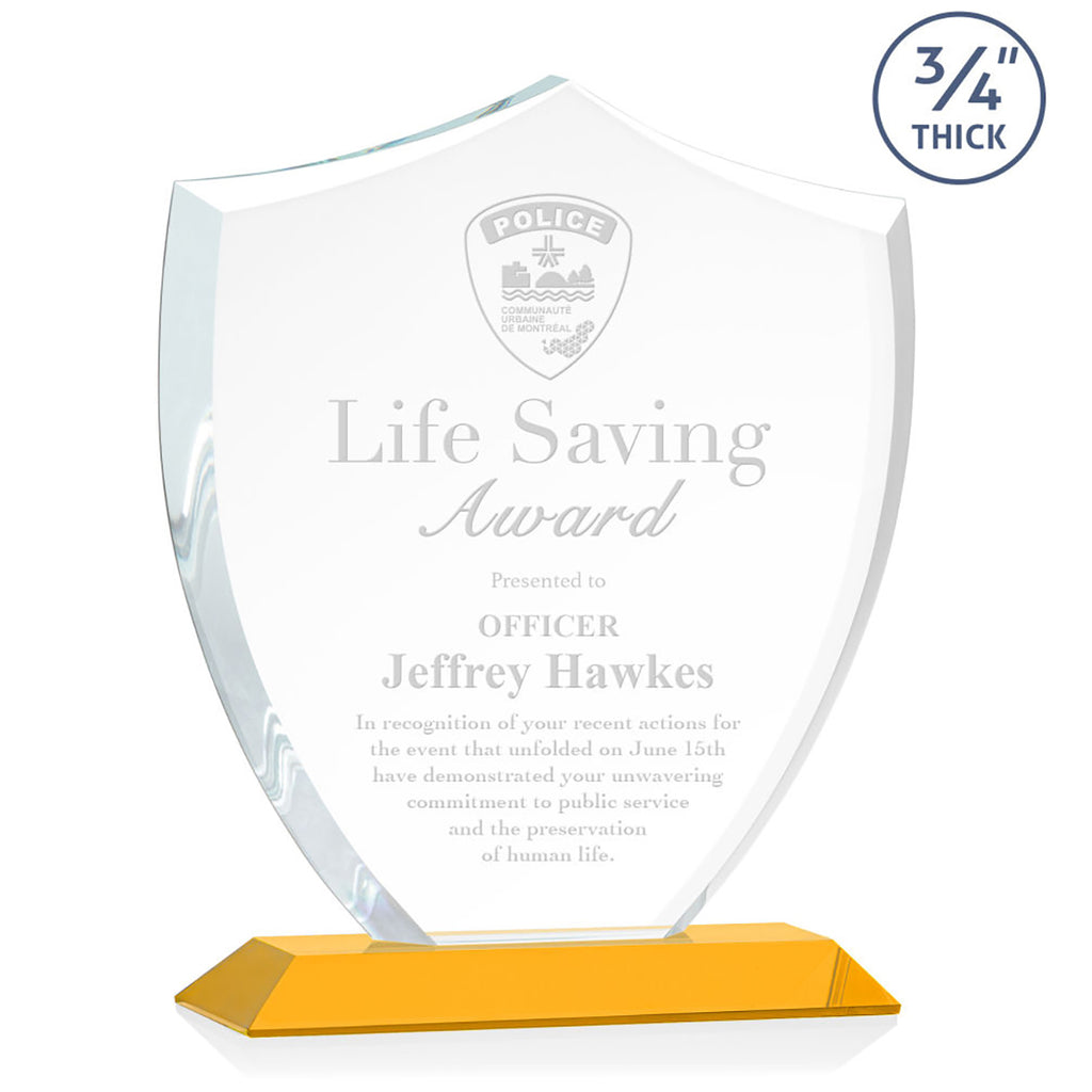 Choose your custom design for the St. Regis Amber Scudo Shield Award 8.125" x 9.75" x 3" with Standard Base - Laser Engraved to show appreciation to those who show excellence daily. The shield design makes these ideal for first responders, law enforcement, and others who focus on protection, authority, and stability in the community. Order early so you do not miss out.The minimum order for this product is 1 piece.