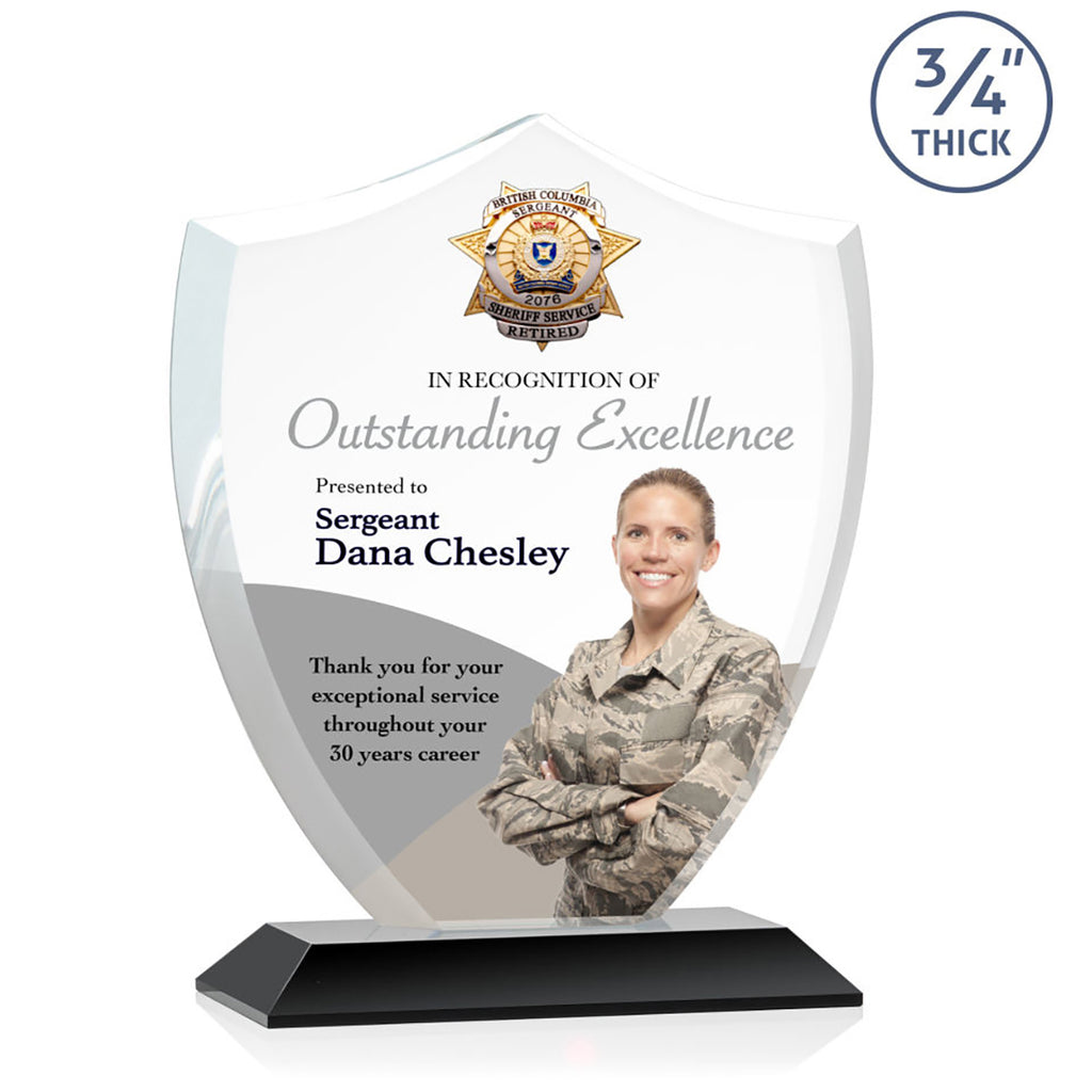 - A shield signifies protection, authority, and stability, making the Scudo Shield VividPrint Award suitable for recognizing outstanding excellence for first responders and law enforcement.