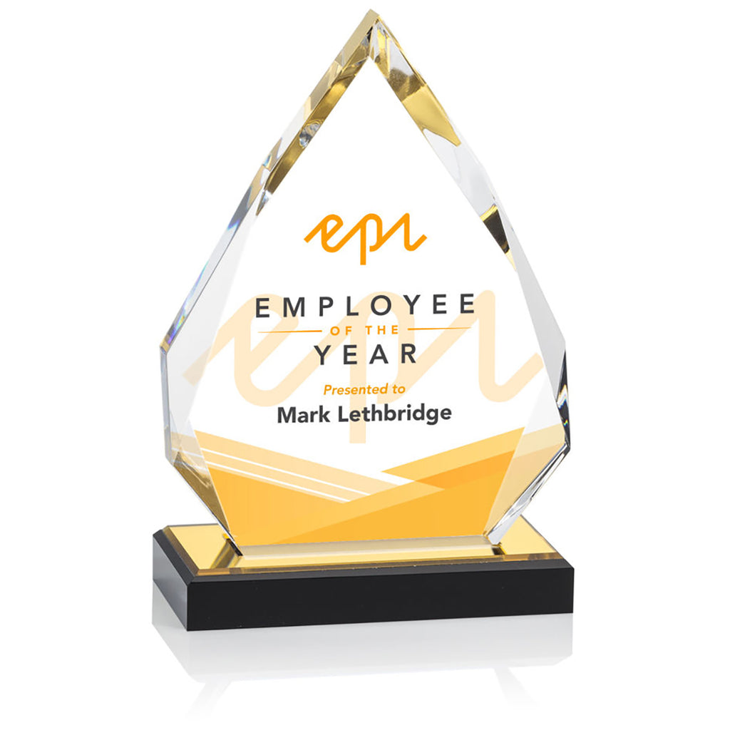 The St. Regis Gold Beckenham Award 5.25" x 7.75" with Standard Base - Printed with a custom or corporate logo is a wonderful way to recognize a special achievement or goal. The gorgeous ebony base with a golden reflective top radiates gold through the interchanging facets toward the peak. Perfect for employment anniversaries, outstanding service, and top marks.The minimum order for this product is 1 piece.