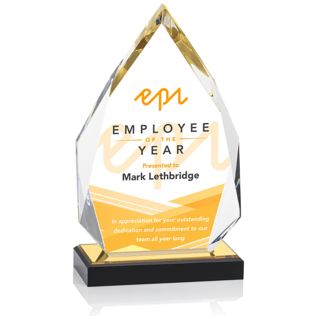 The St. Regis Gold Beckenham Award 5.25" x 8.75" with Standard Base - Printed with a custom or corporate logo is a wonderful way to recognize a special achievement or goal. The gorgeous ebony base with a golden reflective top radiates gold through the interchanging facets toward the peak. Perfect for employment anniversaries, outstanding service, and top marks.The minimum order for this product is 1 piece.